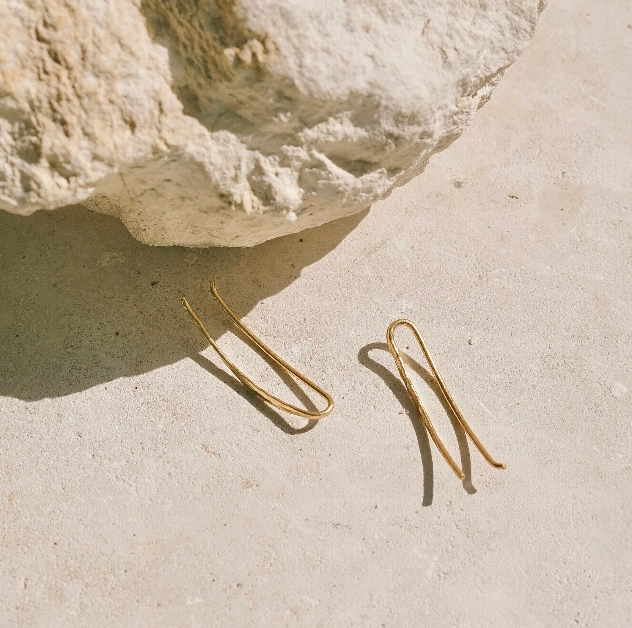 The perfect style from gym to beach to fancy evening. Delicate hammered earrings that thread through the earlobe, designed to be worn without an earring backing as the wire is snug against the back of the ear to ensure it stays secure and 'climbs' up the ear.