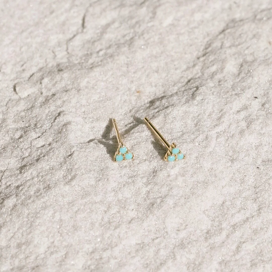 A tiny delicate triangular stud earring with triple prong set turquoise stones.